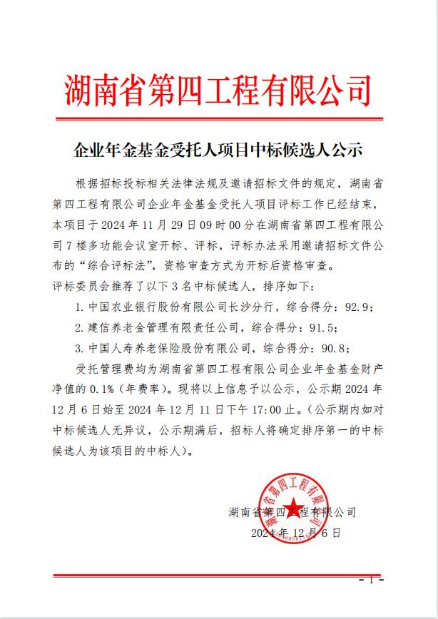 凭证招标投标相关执律例则及约请招标文件的划定,,现将湖南省第四工程有限公司企业年金基金受托人项目中标候选人予以公示(详见如下公牍)。。。。各投标人和其他利害关系人以为招标投标运动不切合执法、规则和规章划定的,,凭证相关的执律例则,,以书面形式递交投诉书。。。。